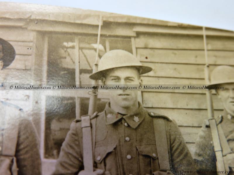 Jolie photo de 3 soldats canadiens, en pied, avec leur équipement web pattern 1908. insignes de col à la feuille d'érable.