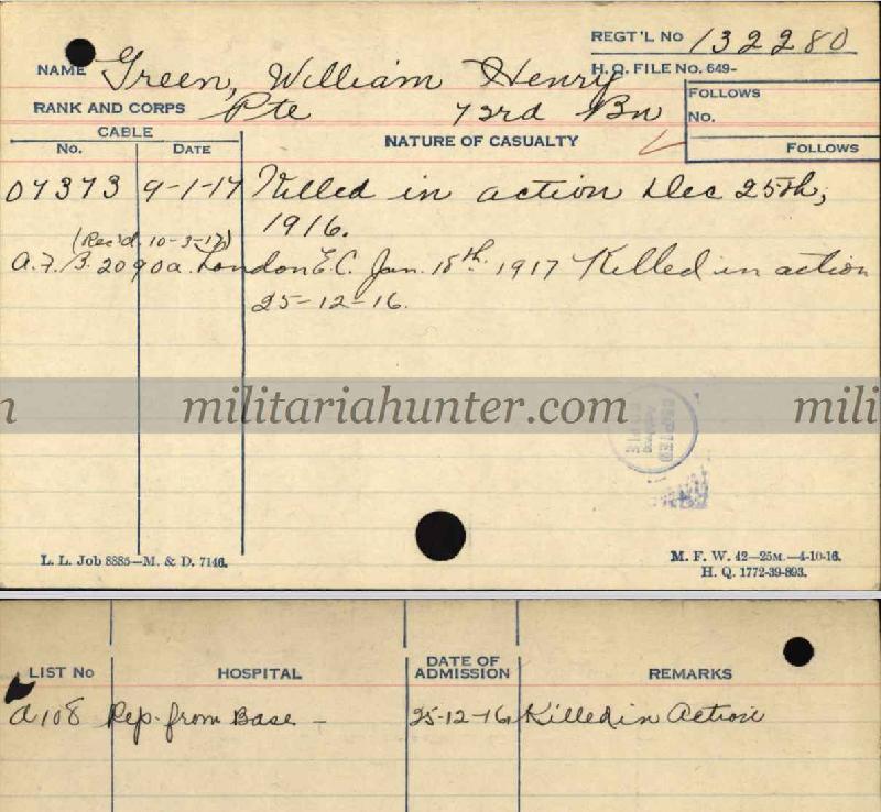 correspondant au private William Henry Green du 73rd Battalion, tué au combat le 25 décembre 1916 à Carency.